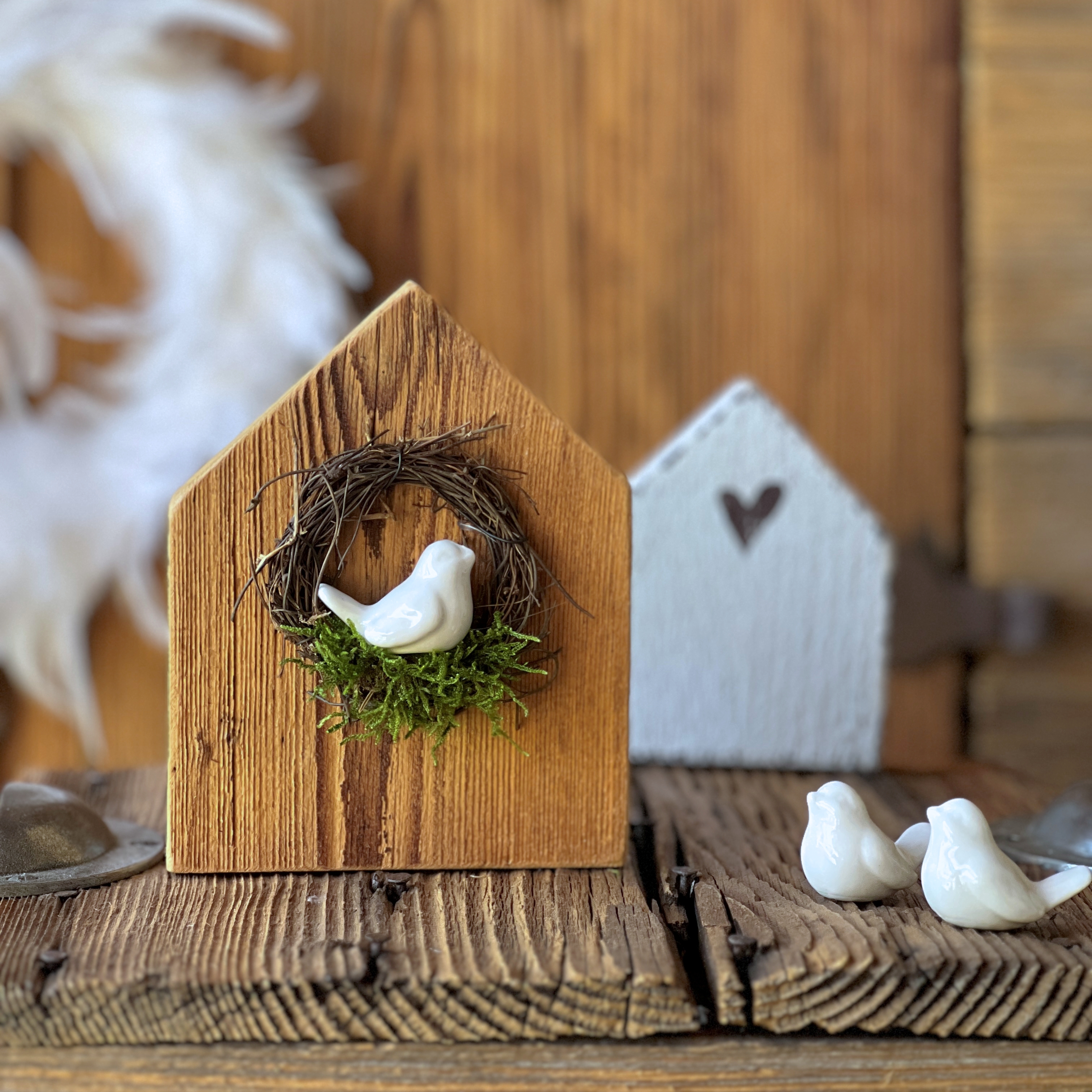 Kleines Porzelanfögeli mit Kränzli aus Ästen und Moos.