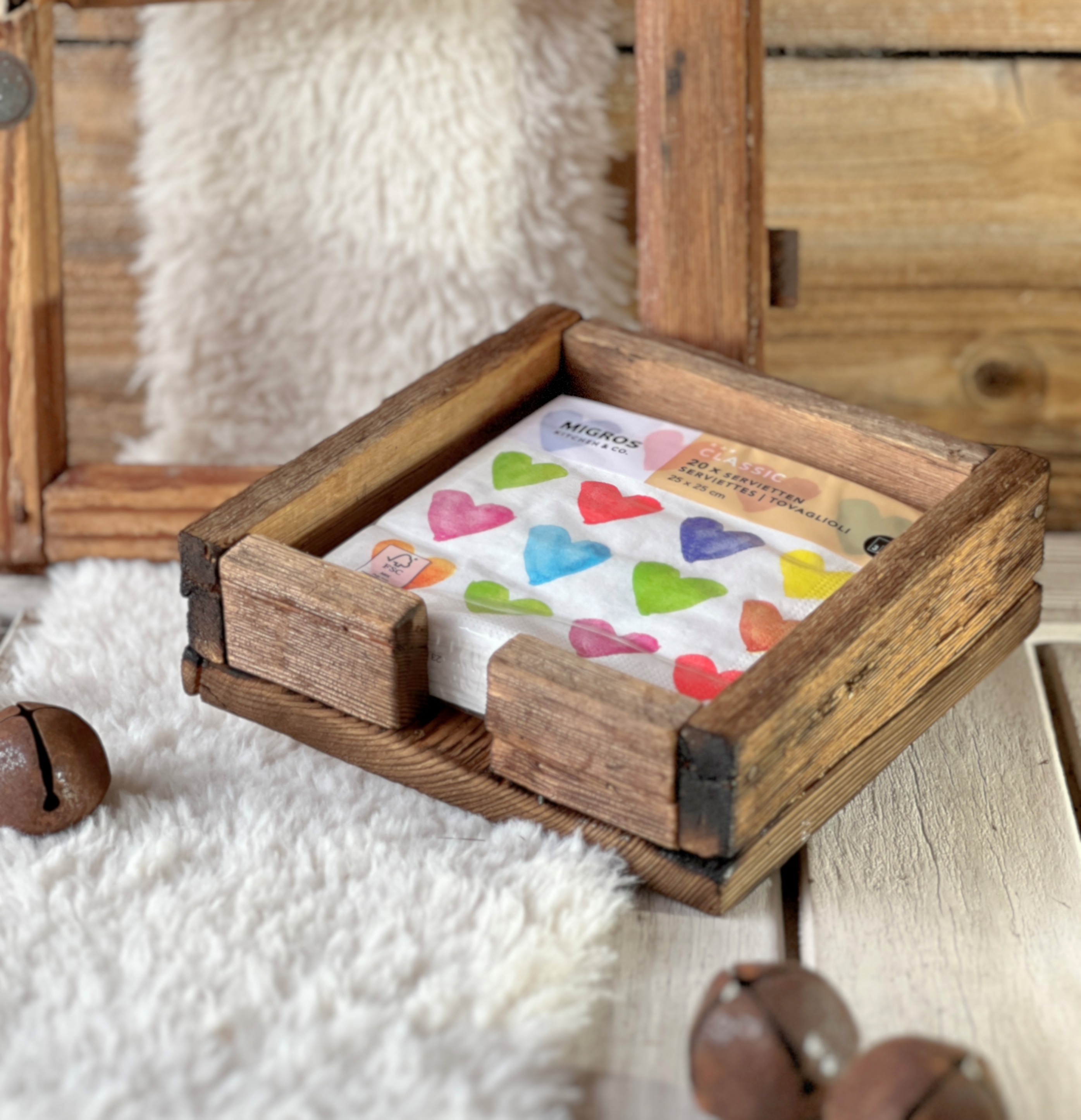 Schöne Servietten-Box aus antikem Scheunenholz im Vintage Look