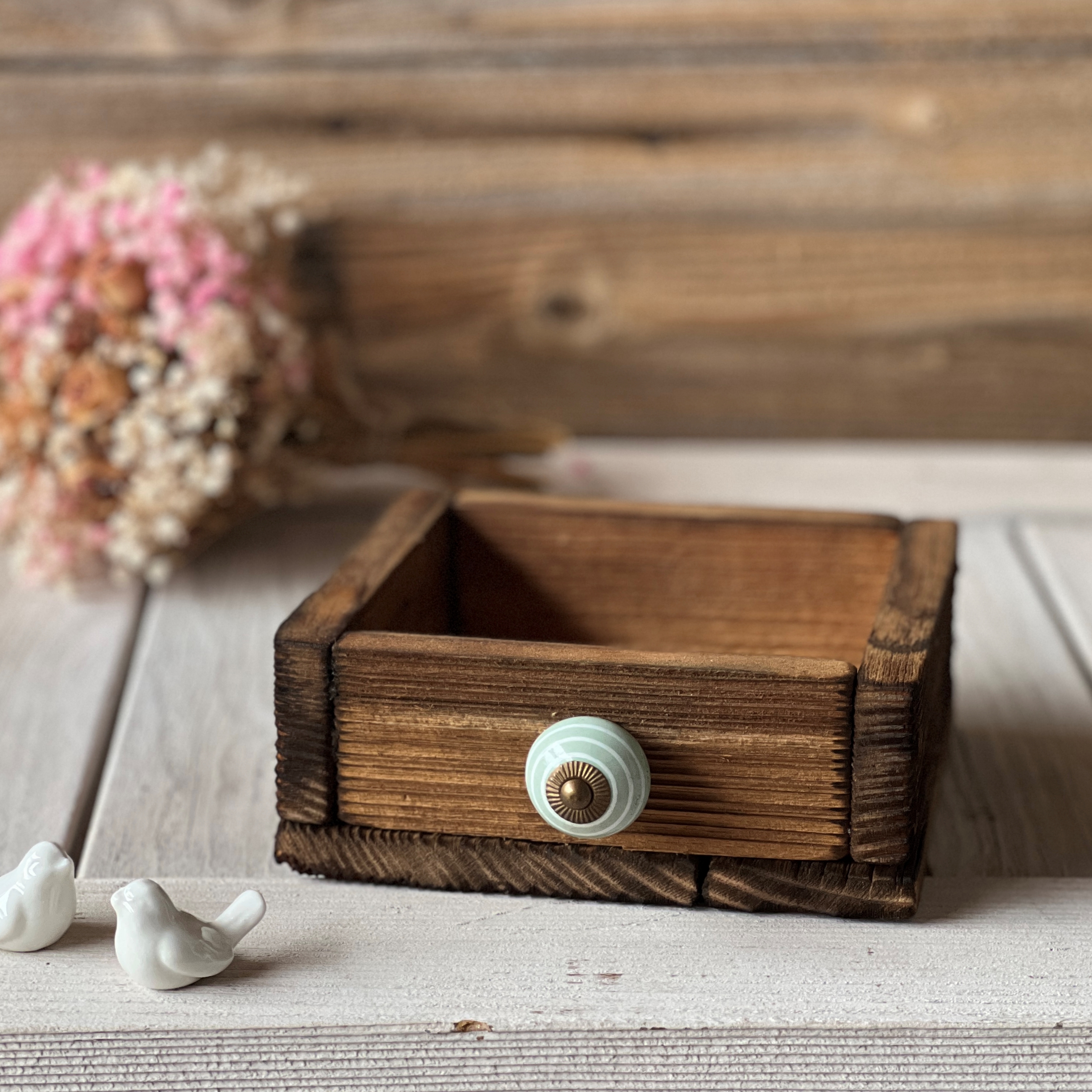 Schöne, Altholzschublade aus verwittertem Holz im Vintage Look.